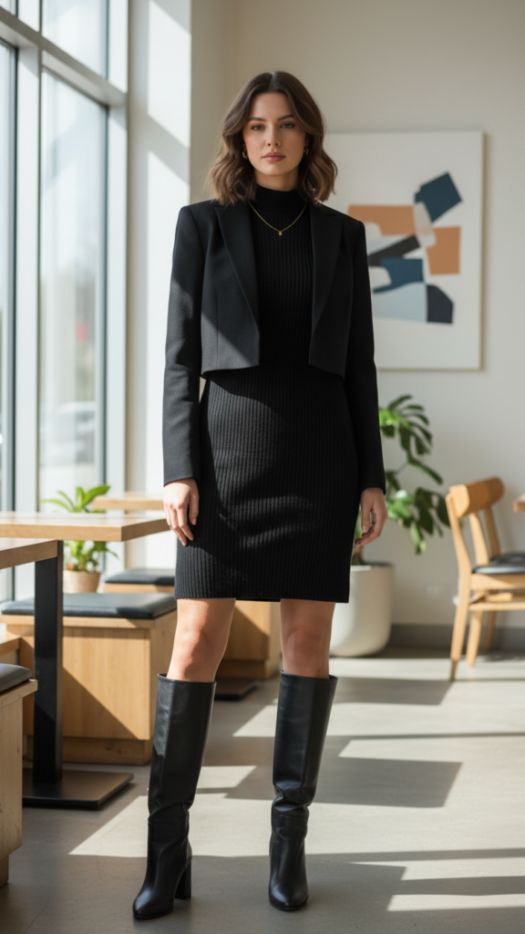 Structured Mock Turtleneck Dress Paired with Knee-High Boots