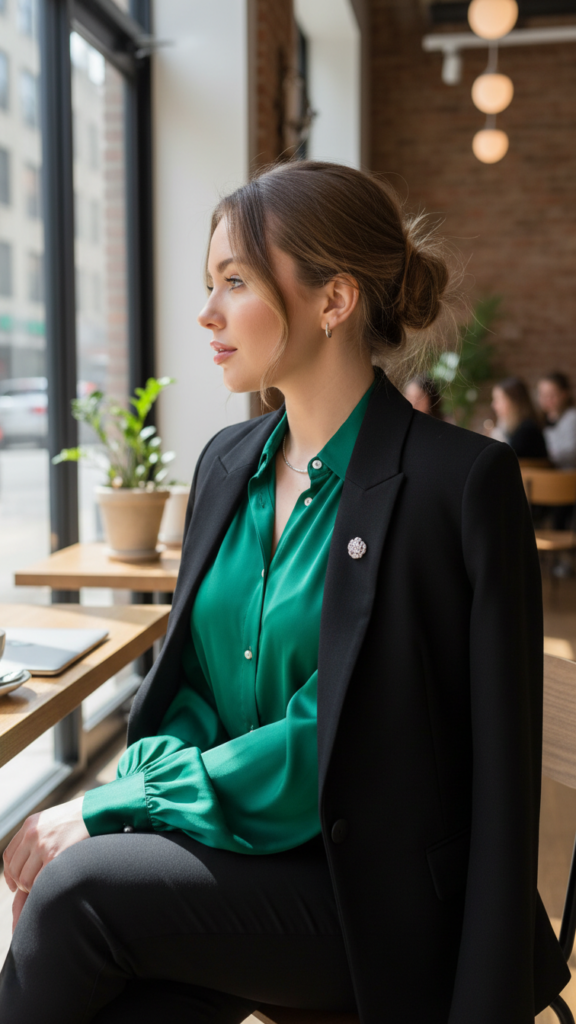 Jewel-Toned Emerald Blouse Complemented by Classic Black Tailoring