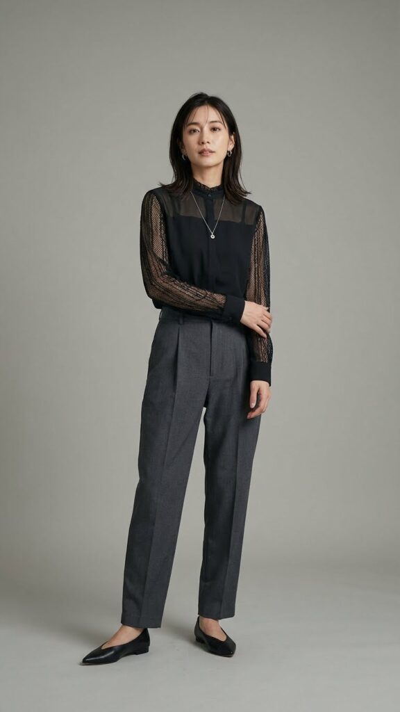 The high waist of sharply cut pants in tones like charcoal or oxblood elongates the figure, complimenting the ethereal blouse. Complete the outfit with pointed flats and understated silver accessories, curating a look that is both hauntingly elegant and business-appropriate.