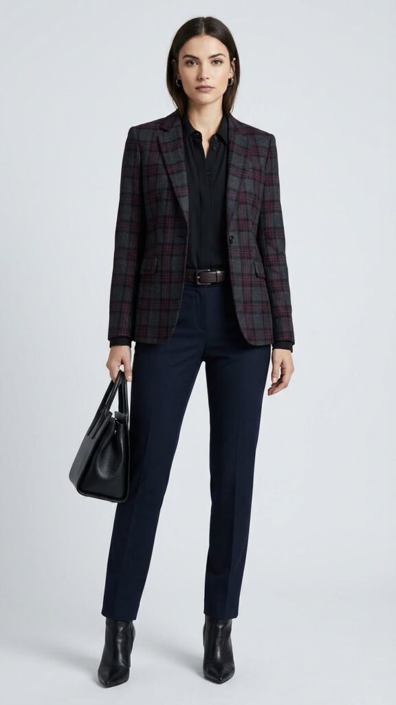 Introducing dark plaid patterns into your gothic office wardrobe, paired thoughtfully with leather accents, adds texture and complexity. Combine charcoal and burgundy tartans for blazers with midnight blue or black trousers to create subtle but impactful contrast.