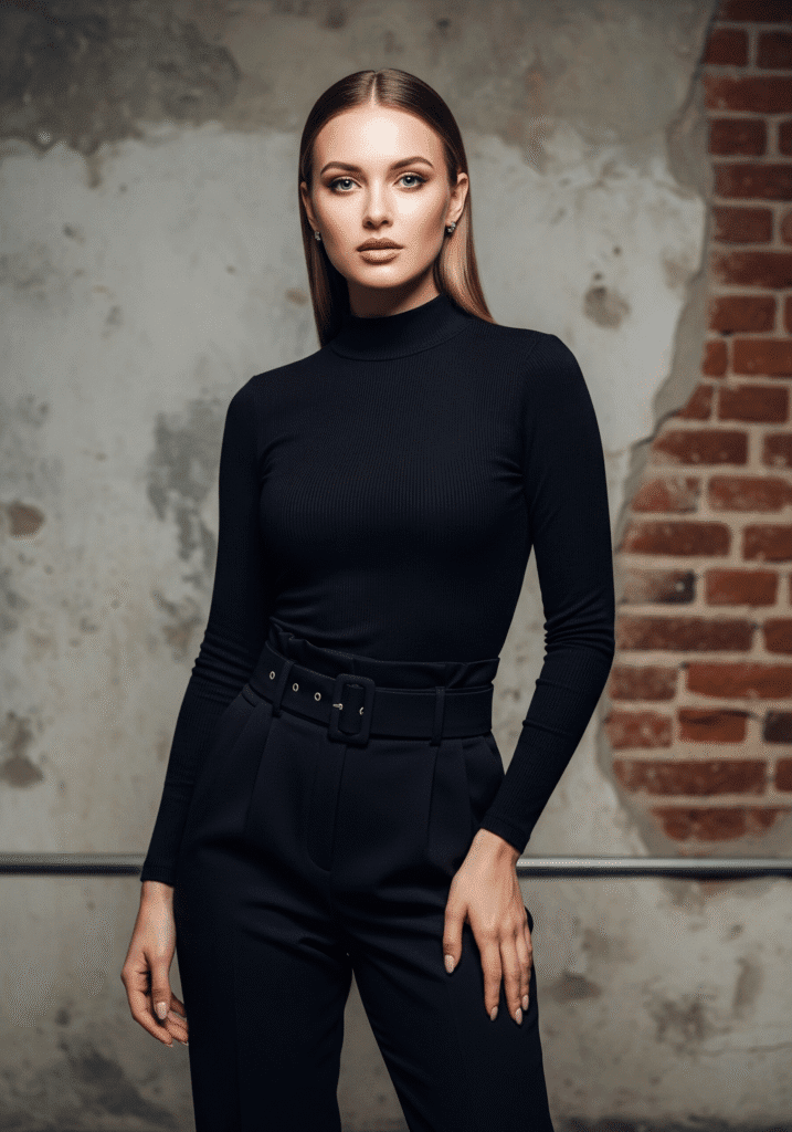 A monochromatic black outfit composed of a tailored blouse, high-waisted trousers, and a statement belt creates an elongating silhouette that’s both elegant and commanding.