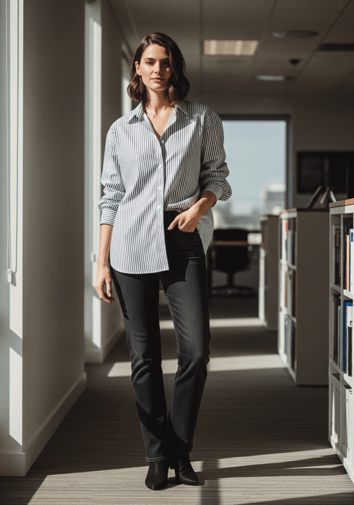 For a casual Friday vibe, an oversized striped shirt paired with dark denim and loafers strikes the right note between informal and office-appropriate.