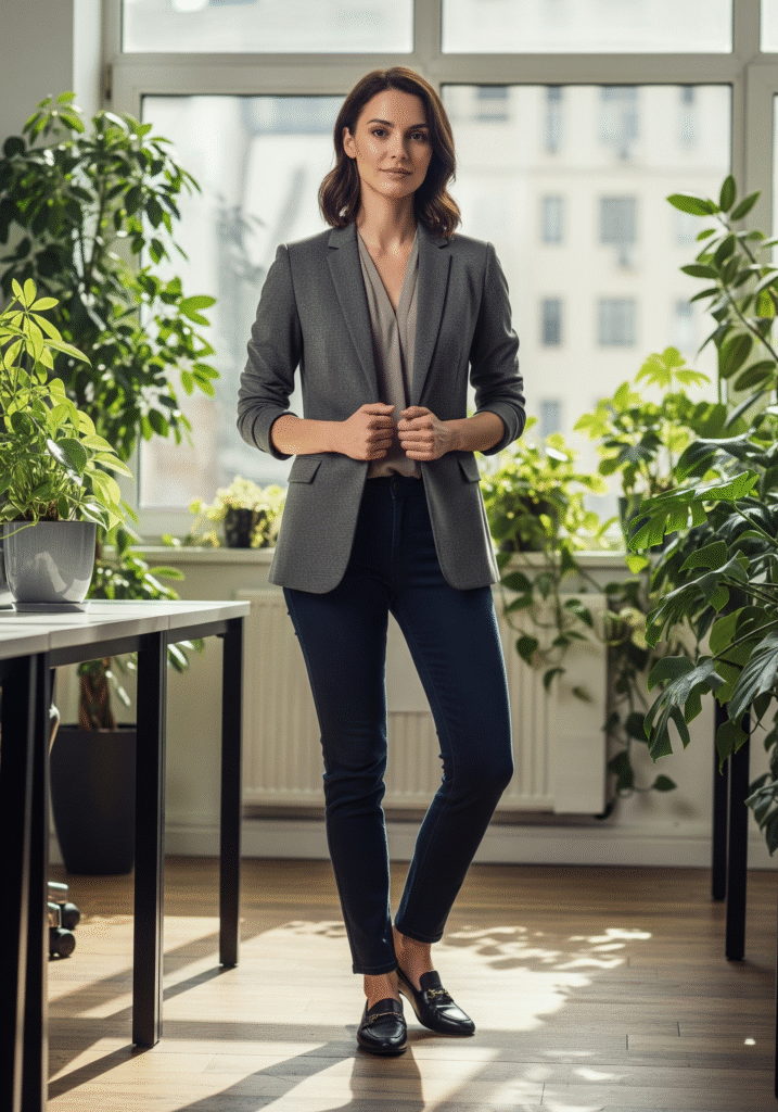 A tailored gray or black blazer paired simply with straight-leg denim and classic loafers offers a modern yet enduring combination suitable for most workplaces.
