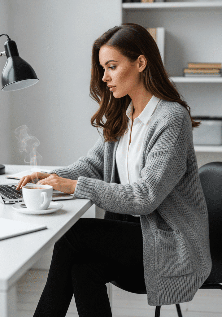 On chillier days, combine a crisp white shirt under a soft wool cardigan with tailored black trousers for warmth without losing style.