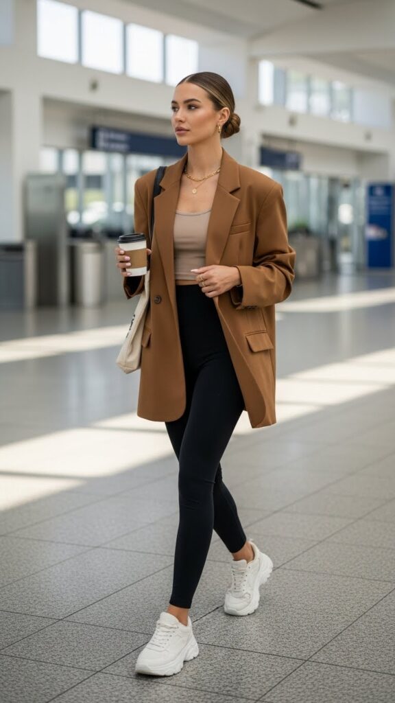 Oversized blazers are the unsung heroes of airport fashion. Match one with high-waisted leggings and a streamlined tank or bodysuit to radiate effortless sophistication. The blazer adds structure and warmth, doubling as a stylish wrap for chilly flights.