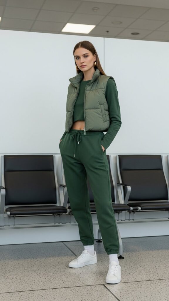 Throw on a cropped puffer vest to master the art of layered warmth. Crisp white sneakers keep the look clean, while a pair of sleek gold hoops hint at casual effortlessness. Elastic waists remain a non-negotiable for in-flight ease.