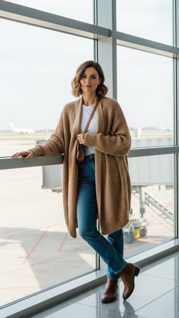 Chelsea boots lend polished practicality with their easy slip-on design. Tuck a compact crossbody under your layers for a sleek silhouette. Whether for an early morning or overnight flight, the cardigan doubles as a cozy wrap on board, perfect for zone-out moments en route.