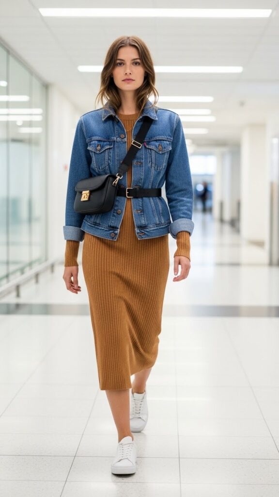 Travelers often overlook dresses, but a long-sleeve midi dress paired with white sneakers and a classic denim jacket nails the perfect balance of style and comfort. This one-piece wonder removes the hassle of coordinating separates, while sneakers keep your feet happy on long terminal strolls.