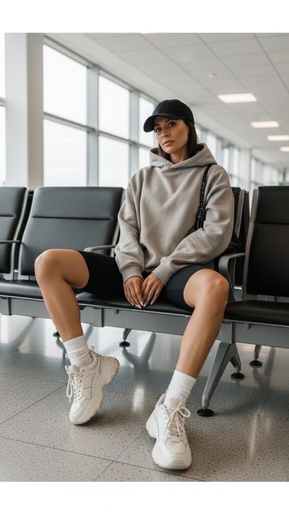 Though divisive in some circles, pairing sleek black bike shorts with an oversized hoodie hits peak casual comfort—sometimes, that’s exactly what the journey requires. Keep the hoodie fresh and structured, avoiding anything too worn.