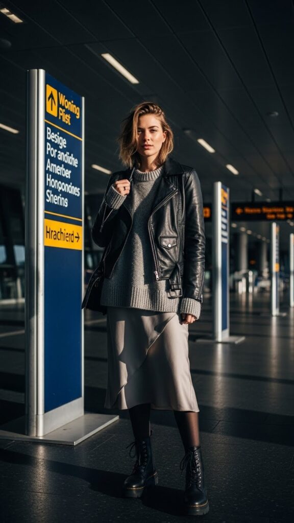 Slip skirts aren’t just for warm seasons. Layer one over thick tights, pair with an oversized sweater, and finish with rugged combat boots to nail an edgy yet practical autumn airport ensemble. The feminine silhouette is balanced with grounded footwear for versatility.