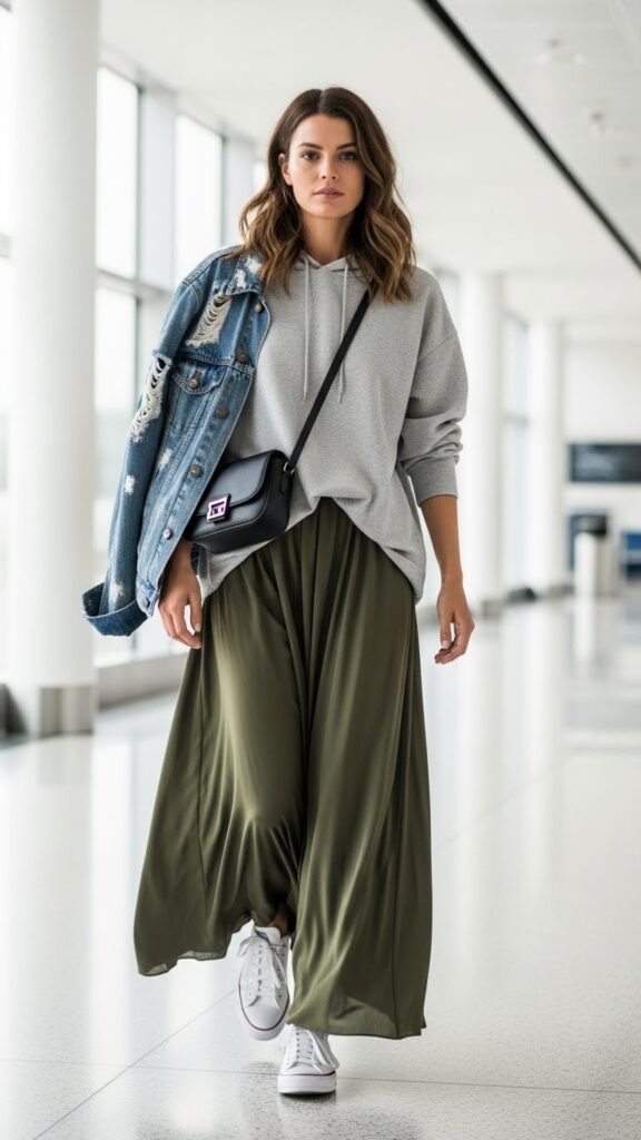 Combining a flowing maxi skirt with sneakers and an oversized hoodie expertly balances femininity and casual comfort. The skirt allows freedom of movement, while the hoodie’s relaxed fit keeps the vibe laid-back.