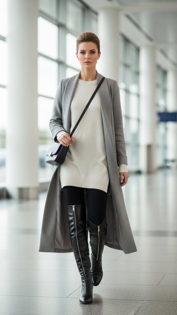 Wearing leggings beneath a long, flowing tunic sweater paired with sleek knee-high boots delivers a streamlined silhouette that’s both flattering and practical. The tunic provides ample coverage while leggings excel in comfort during extended travel periods.