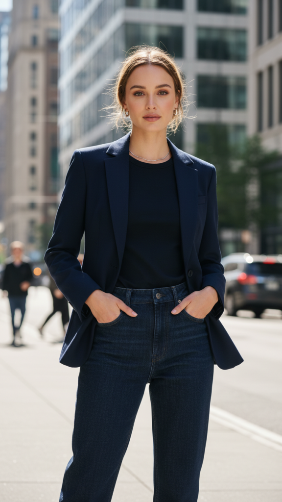 Sleek Dark-Wash Jeans Paired with a Tailored Blazer