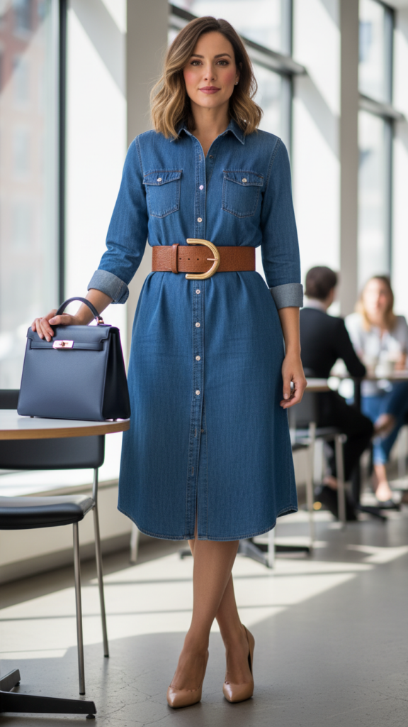 Though often perceived as overly casual, denim shirtdresses can certainly be transformed into refined office ensembles. Enhance your look by cinching the waist with a distinctive leather or metal belt for added structure. This effortlessly upgrades the silhouette and introduces tailored appeal.