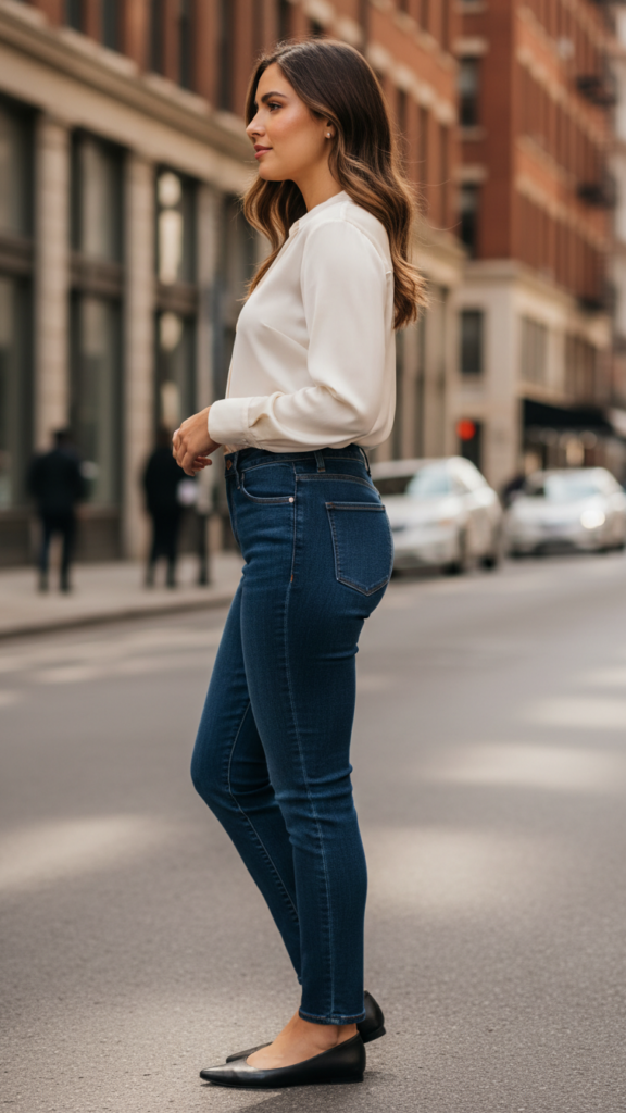 High-Rise Jeans Coupled with a Silk Blouse and Sophisticated Flats