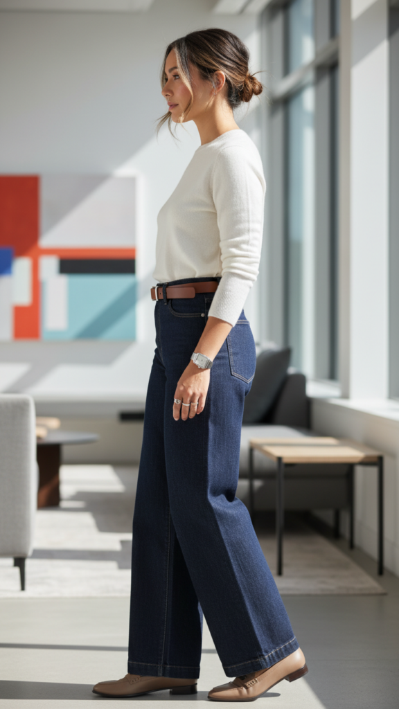 Select neutral hues like cream, navy, or gray for your sweater to complement the roomy jeans without diluting their impact. This combination is ideal for client interactions or presentations, where professionalism and style must harmonize. Incorporate structured accessories such as leather loafers and a refined belt to finish off this contemporary office look. Discover related styles at wide leg jeans collection.