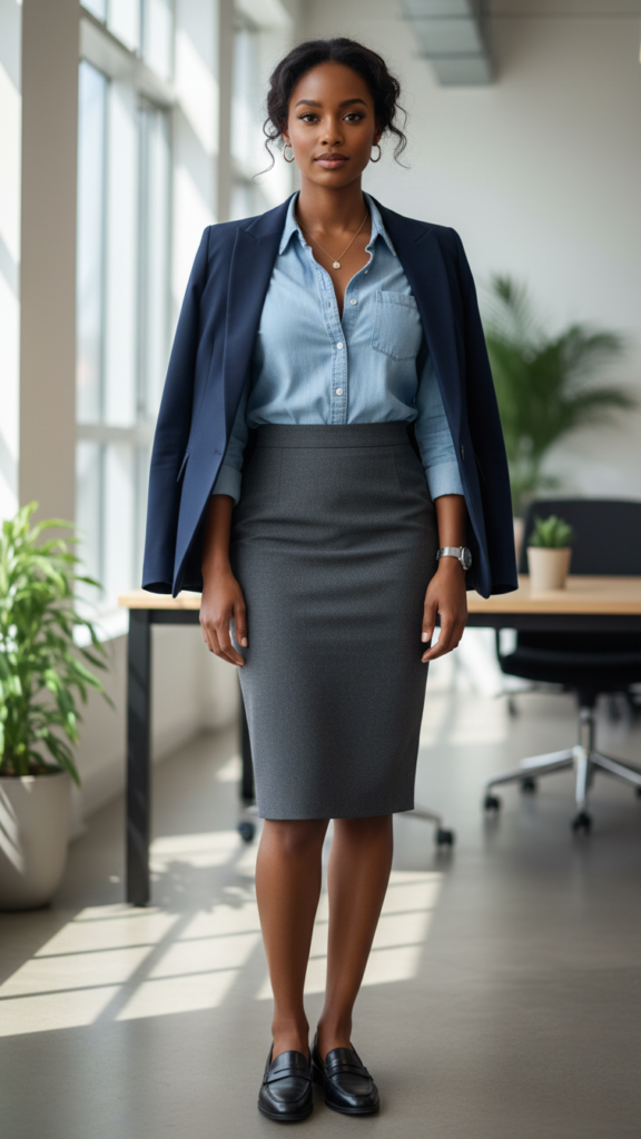 Chambray Shirt with a Tailored Pencil Skirt and Classic Loafers