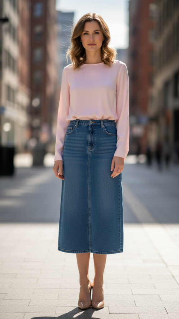 A midi-length denim skirt paired with a tucked-in blouse and smart heels offers an effortlessly chic office ensemble, balancing formal aesthetics with contemporary flair. The midi cut ensures ample coverage, aligning with most corporate dress codes.