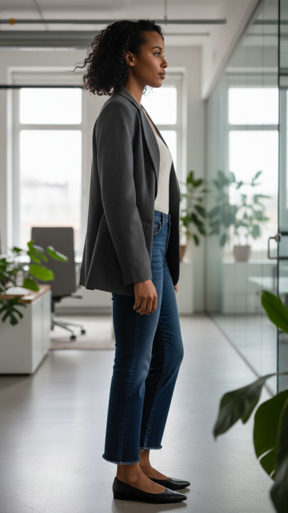 Opt for jeans featuring minimal fading and a structured cut that contours without looking too casual. Pair these with blazers in timeless shades such as navy, charcoal, or classic black, crafted from luxurious fabrics like wool or ponte knit. This mix transforms casual denim into a polished look that’s perfect from Monday meetings to client presentations. Notably, black jeans serve as a versatile base to build multiple work-friendly denim looks during the week.