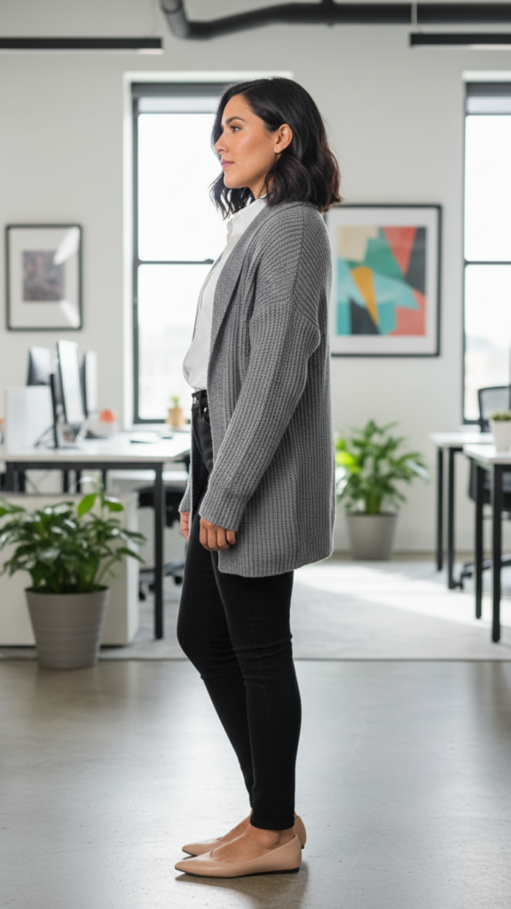 Choose well-tailored black jeans that convey polish over casualness. Tuck your shirt neatly and opt for cardigans in muted colors such as navy, cream, or gray for seamless coordination. Footwear choices like pointed flats or low heels round out this ensemble with subtle sophistication. For alternatives, white pants can substitute denim for a fresh, professional look.