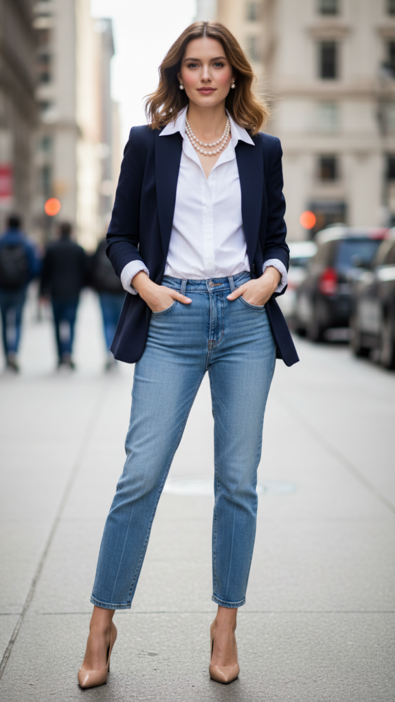 Soft Light-Wash Jeans with Navy Blazer and Elegant Pearl Accents