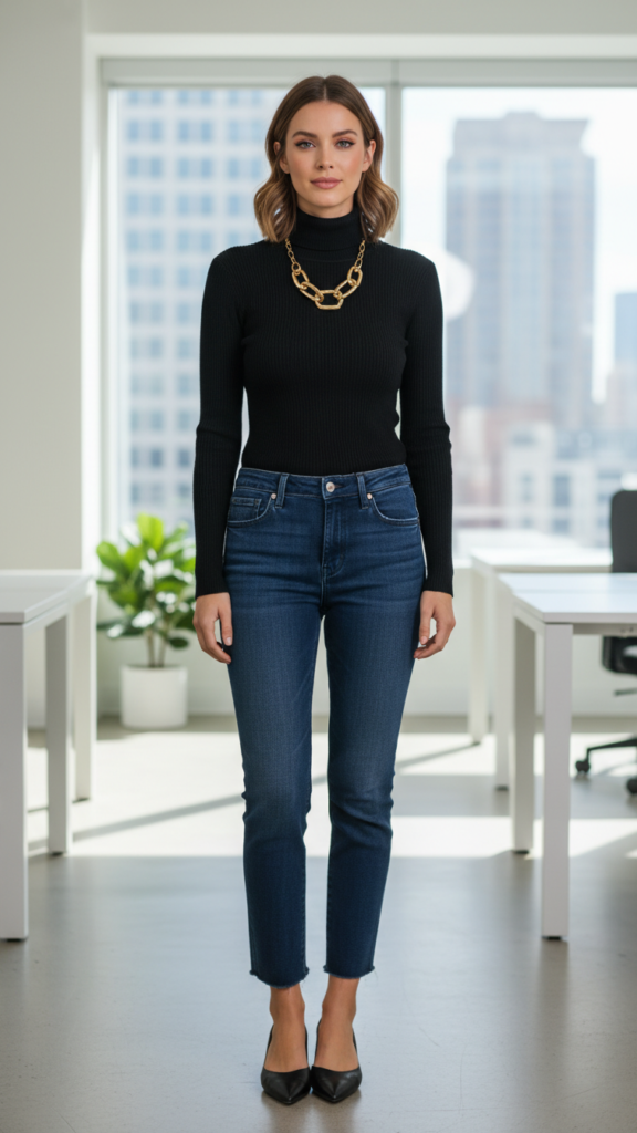 Though cropped jeans usually imply casual, pairing them with a sleek fitted turtleneck and eye-catching statement jewelry elevates them to boardroom readiness. Select dark variants that end just above the ankle to keep clean lines.