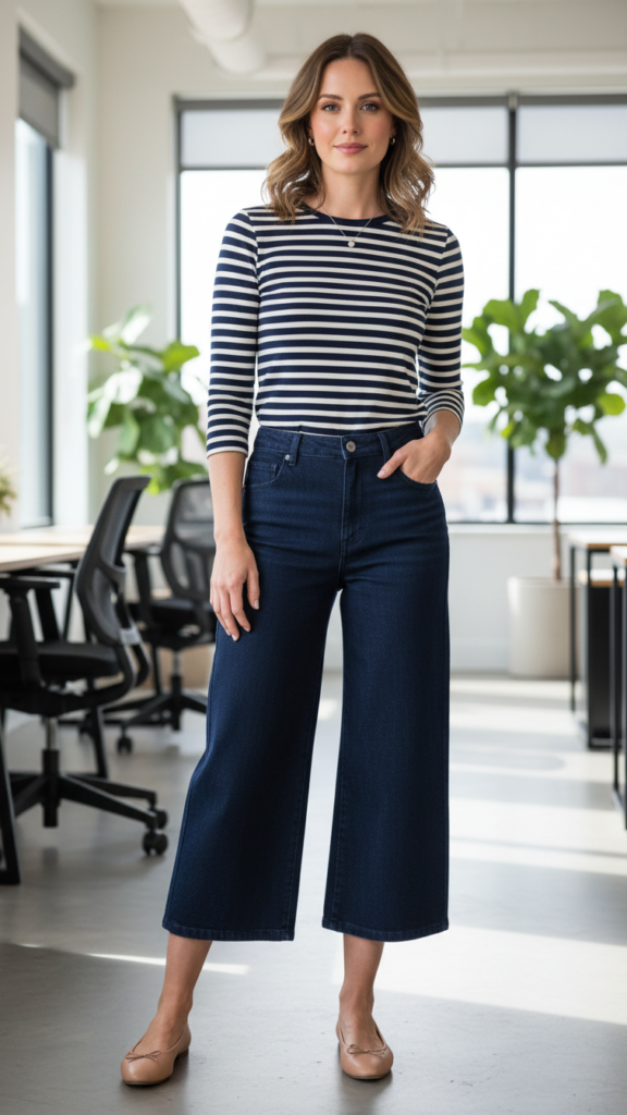 Denim culottes provide a chic yet practical option for office wear, merging textural interest with breathability and ease. Pair them with a timeless striped shirt—navy and white or gray and white—for subtle complexity without overwhelming the outfit.