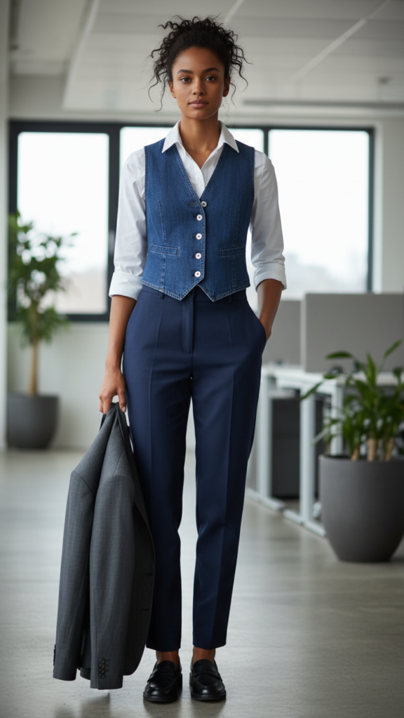 Incorporate a denim vest over a crisp button-down and pairing with tailored trousers for a fresh, textured look that stays firmly within office boundaries. Select vests in moderate indigo or darker to maintain professionalism.