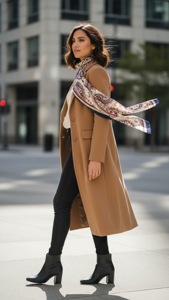 Skinny Jeans Styled with a Longline Coat and Elegant Scarf