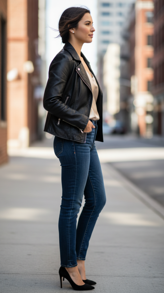 Vintage-Style Denim Worn with a Silk Camisole and Leather Jacket