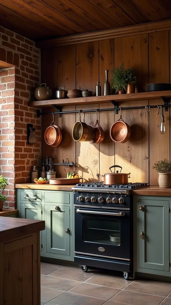 Combine brick walls with vintage-style iron light fixtures and wooden ceiling beams to unify your kitchen’s rustic theme and create a memorable centerpiece.