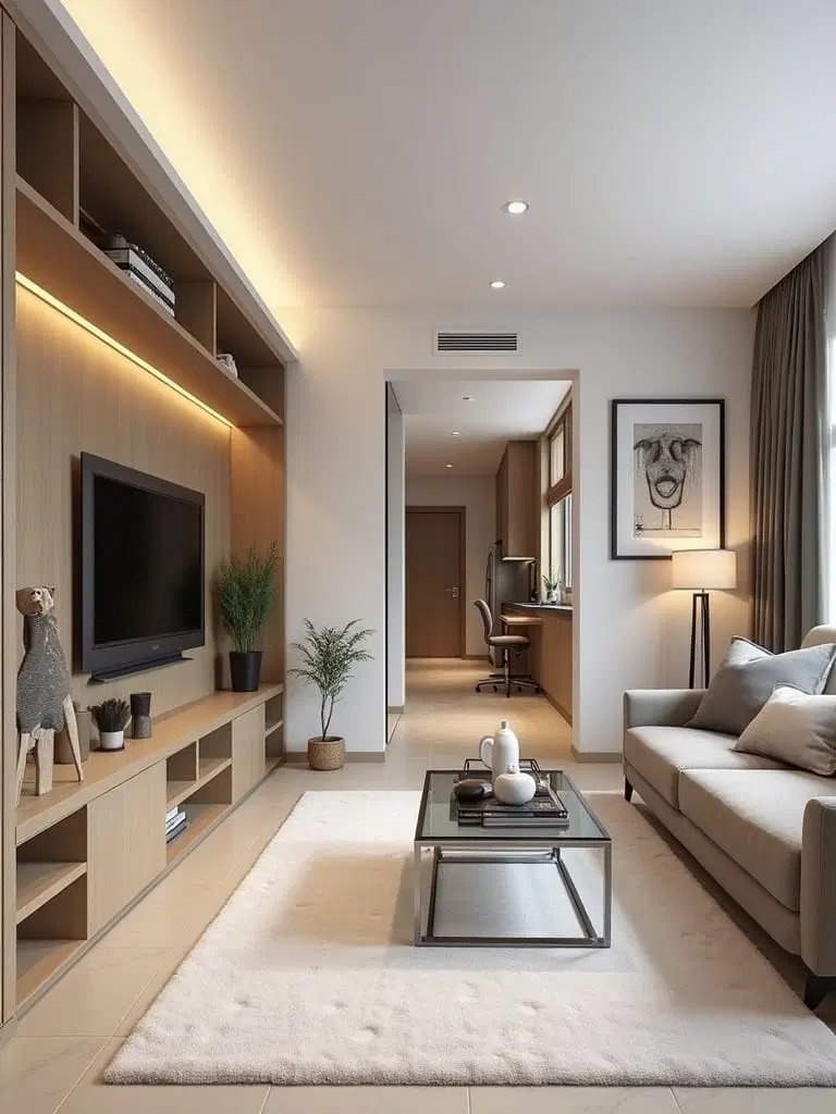 Choosing light finishes for built-ins enhances brightness, making your narrow living room feel spacious and welcoming.
