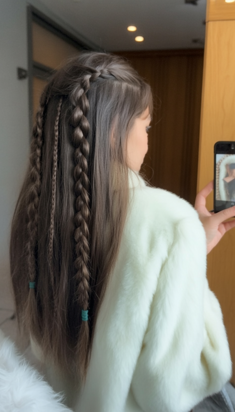 Adding sleek, thin braids at the crown offers a playful sophistication to otherwise simple straight hair. The remaining length cascades smoothly like satin, creating a look that’s age-appropriate and youthful. Start by blow-drying hair straight, then form two narrow braids from the front sections and secure them flat at the back. A touch of shine serum ensures gloss throughout, while a flexible hairspray permits natural movement. This style suits medium to long hair and works beautifully as a transitional style during grows outs of bangs or layers.