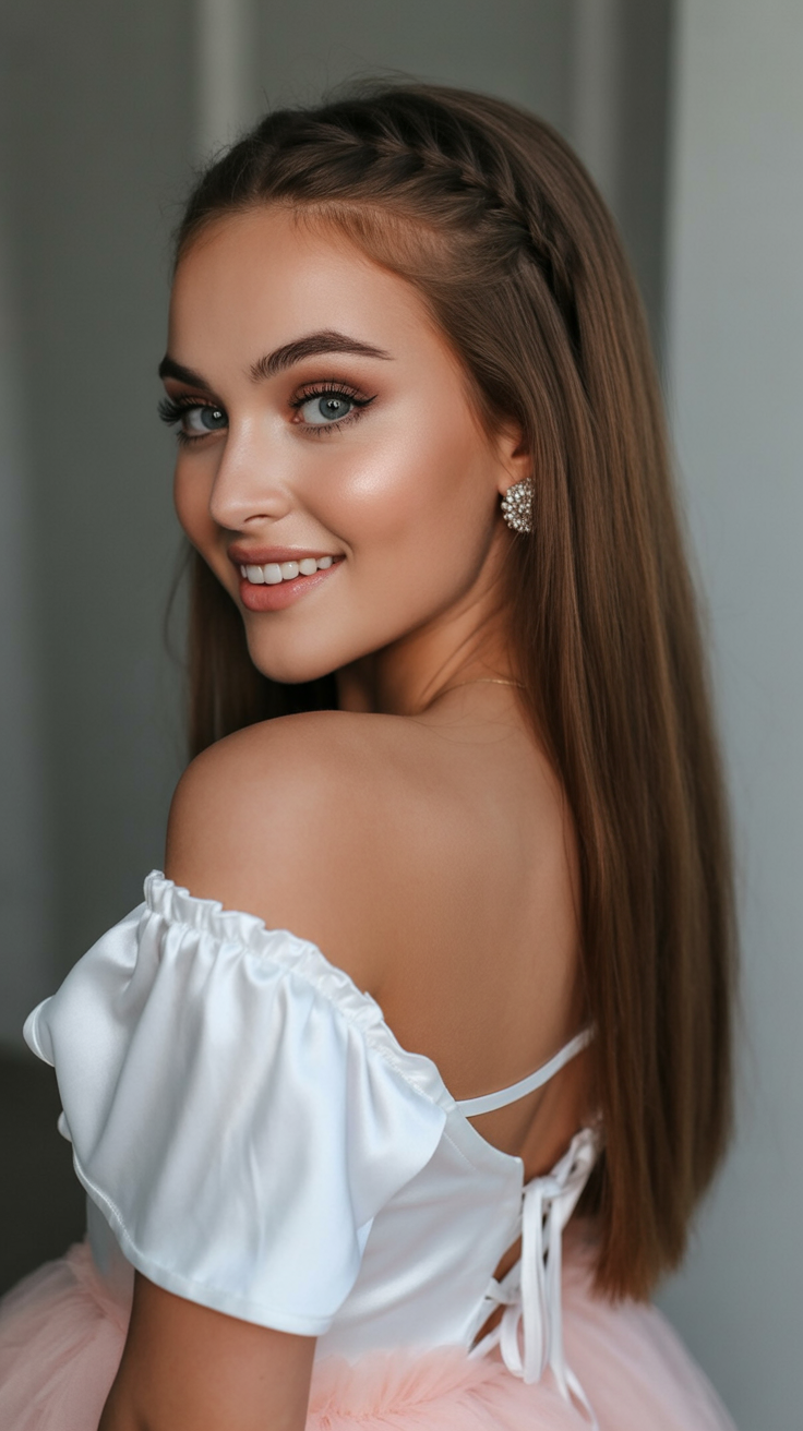 Twin, delicate braids on either side of the head feed seamlessly into straight, smooth strands, balancing romantic flair with polished sleekness. Tiny braids outline the face, subtly enhancing eye focus and curbing flyaways. This understated tweak refreshes your look without changing length and is perfect for those who wear glasses. A sparkling barrette adds a formal touch for evening occasions.