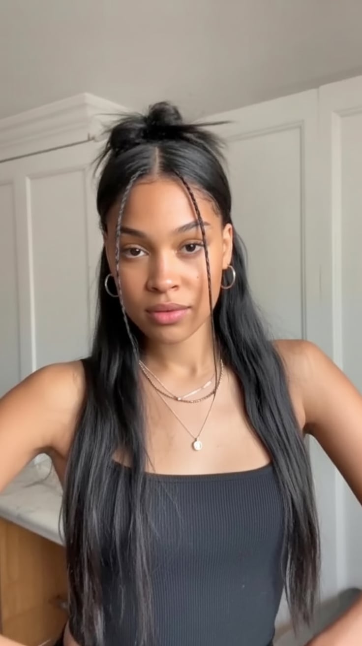Incorporating a few tiny braids intermittently throughout smooth hair brings a contemporary, artsy accent without cluttering the look. These subtle plaits serve as a form of strand embellishment—perfect for adding a personal touch that enhances rather than dominates. Pair with crisp attire, minimalist hoops, and soft lips to let the braids be the focal detail. Suitable for medium to long hair lengths, micro-braids should remain slender on fine strands to preserve volume and contrast.