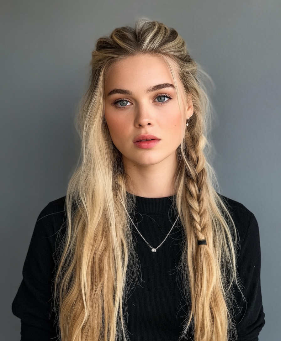 Elevate ordinary mid-length or long hair with a soft half-up twist combined with a strategically placed single braid. This asymmetrical braid acts like a subtle but striking necklace framed amidst sleek, straight tails. Maintaining blunt ends enhances the intentional sharpness of this style. A touch of light texture at the crown adds volume, while the sleek finish keeps it modern and polished—ideal for those seeking a fresh update without a full restyle.