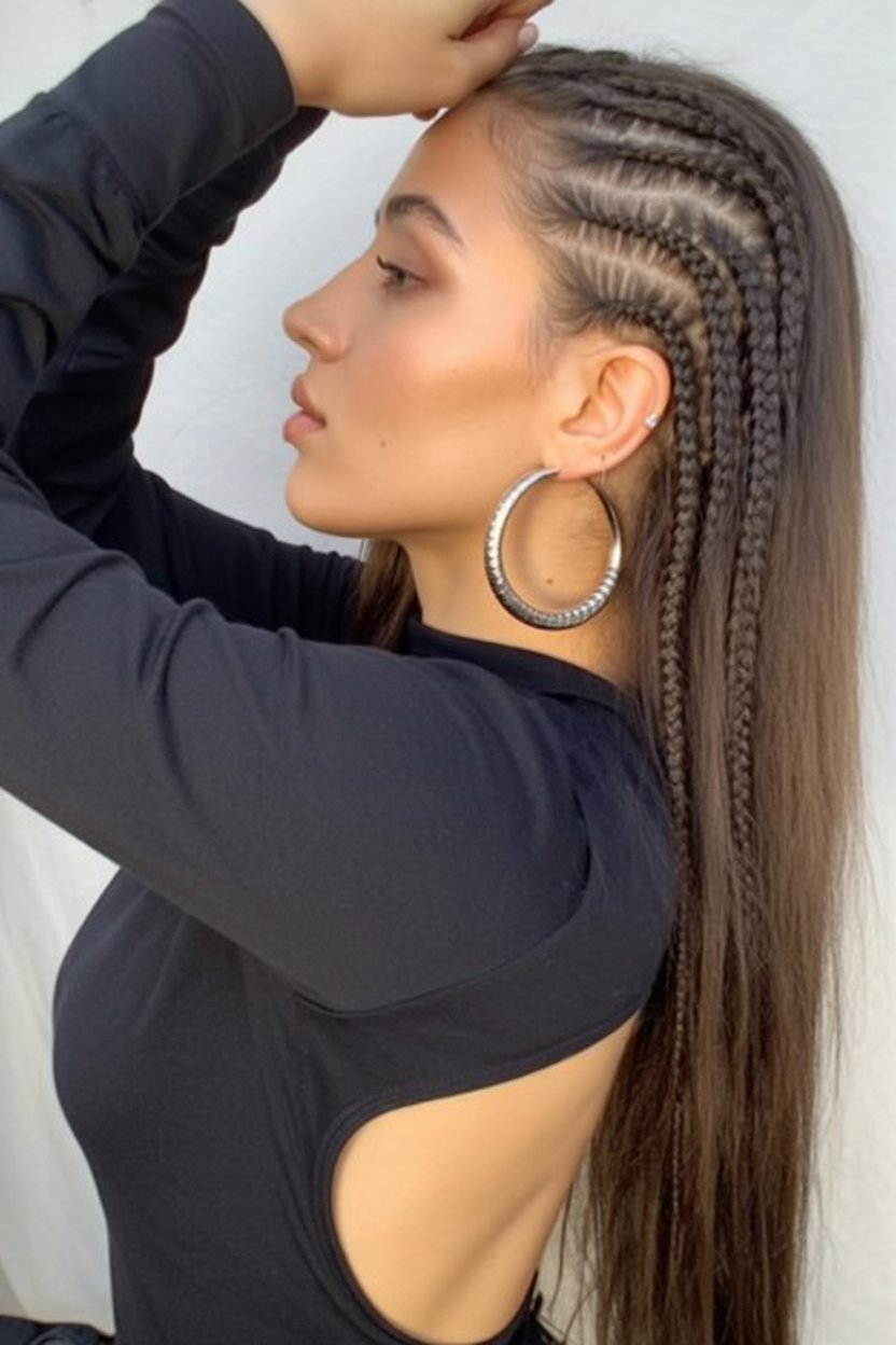 A regimented line of cornrows along the side adds architectural interest and sharpens facial contours. This bold, runway-inspired look is both functional and stylish, especially popular among Black women. Proper technique with gentle tension ensures comfort for sensitive scalps. To preserve the style, use nourishing oils and opt for satin pillowcases during sleep. Works best on medium to long hair lengths and is suited for daily wear to sophisticated events.