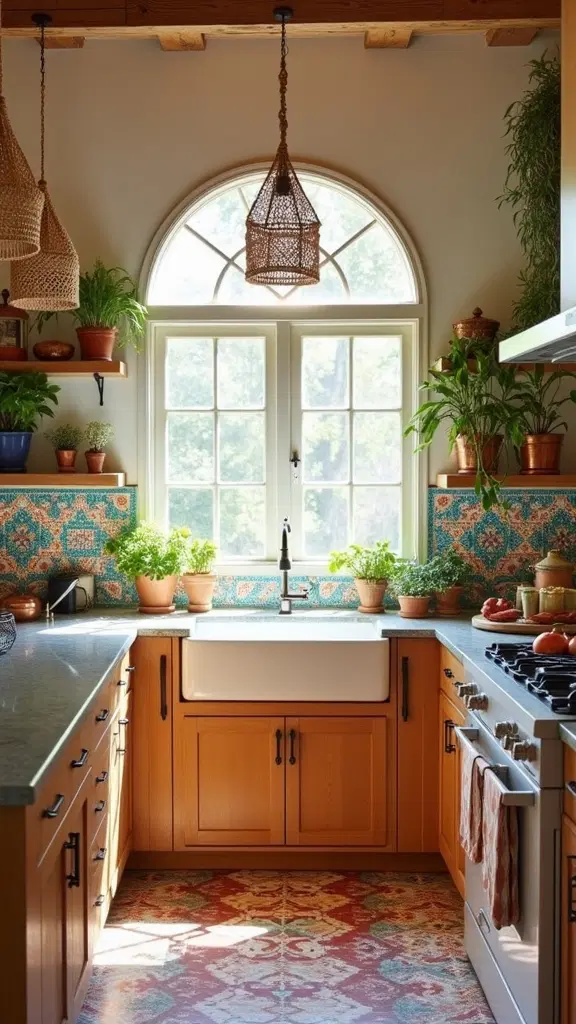 Explore various bohemian rugs, Moroccan tiles, and rattan light fixtures to complement your kitchen’s transformation. For adding natural charm, consider macramé plant hangers that blend style with greenery effortlessly.