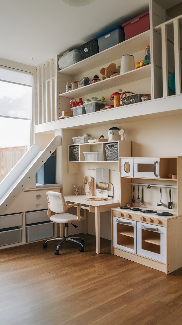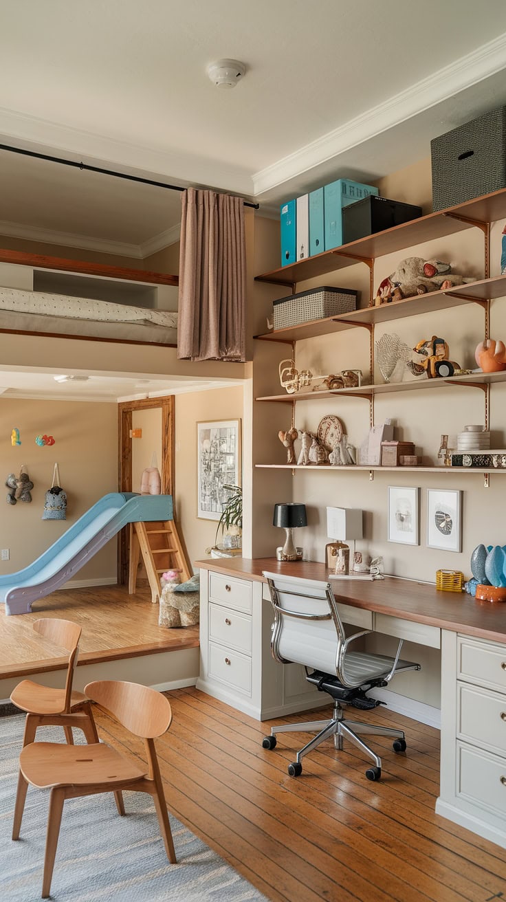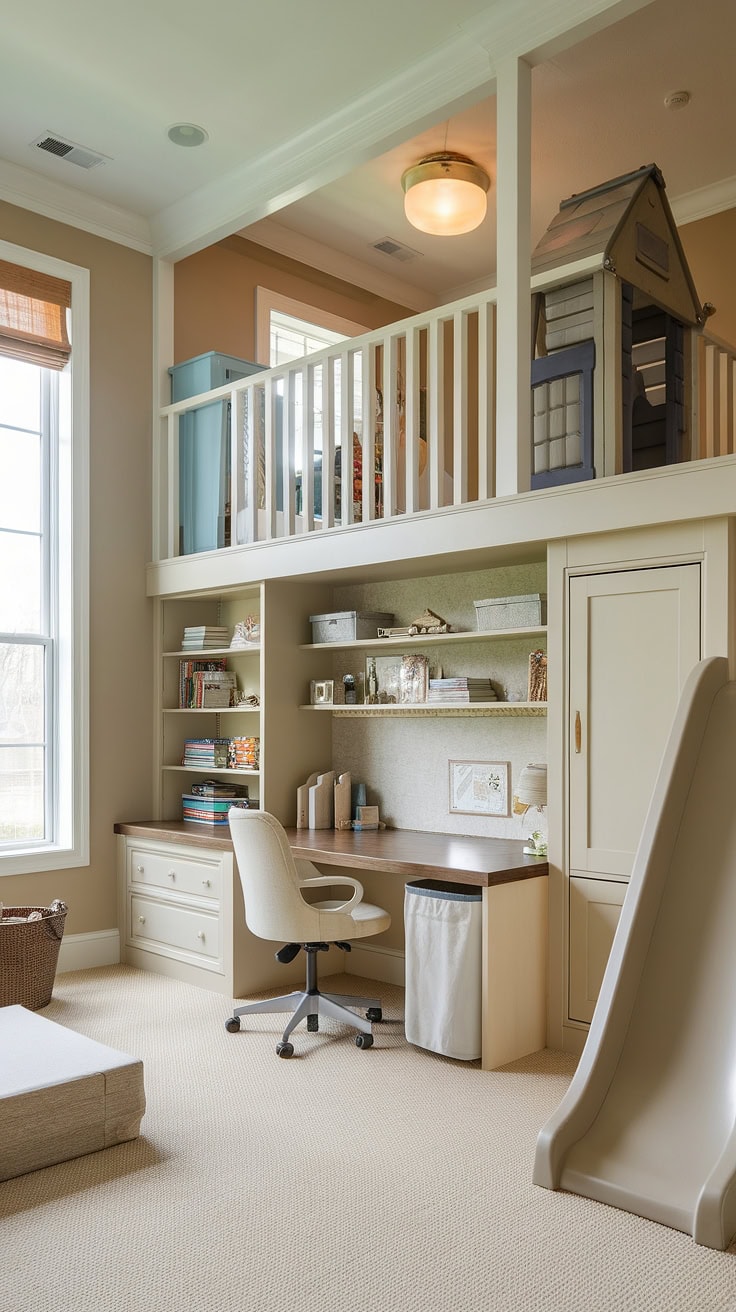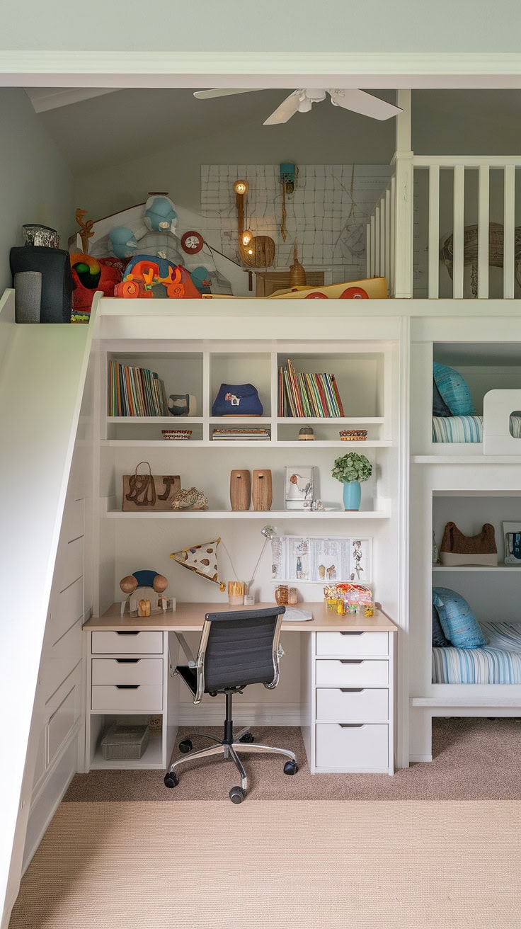 Maximizing at-home work life, this combined office-playroom features a prominent loft complete with a slide and built-in storage solutions. It creates an inspiring environment suitable for homeschooling or acting as a guest-friendly space, ideal for boys sharing a room.