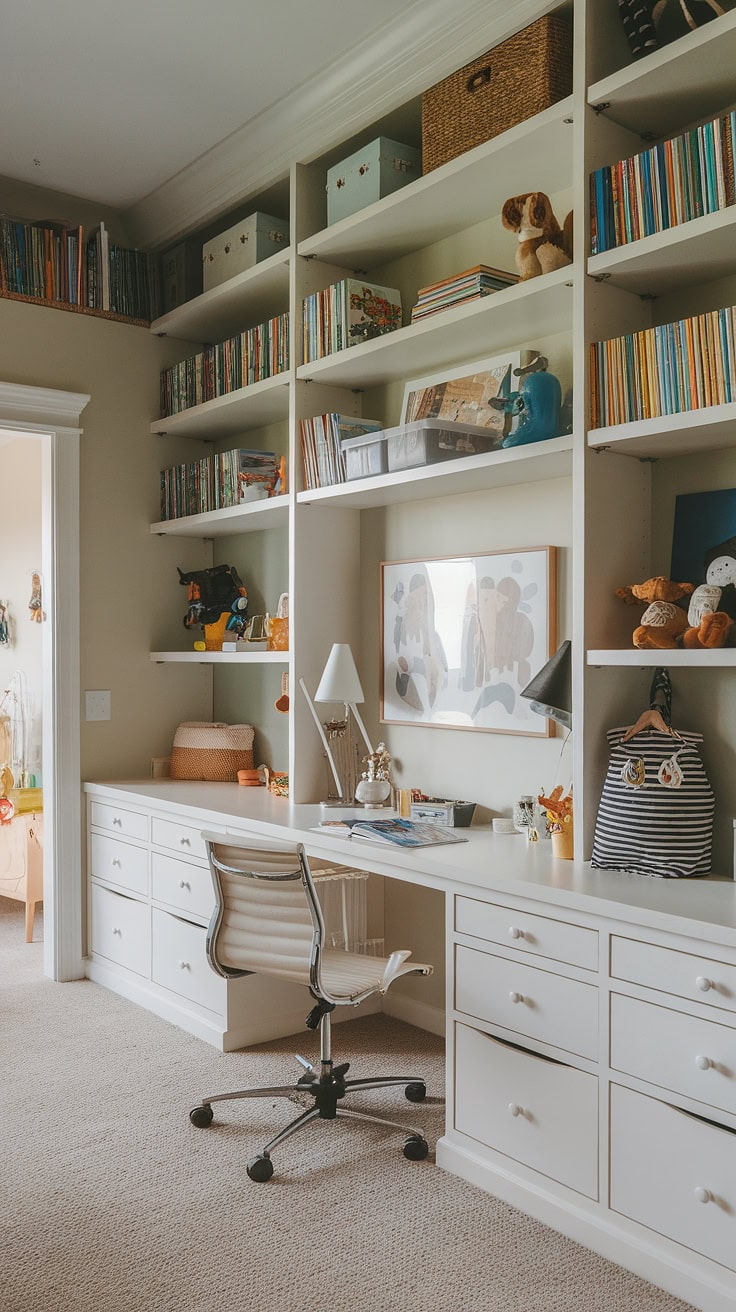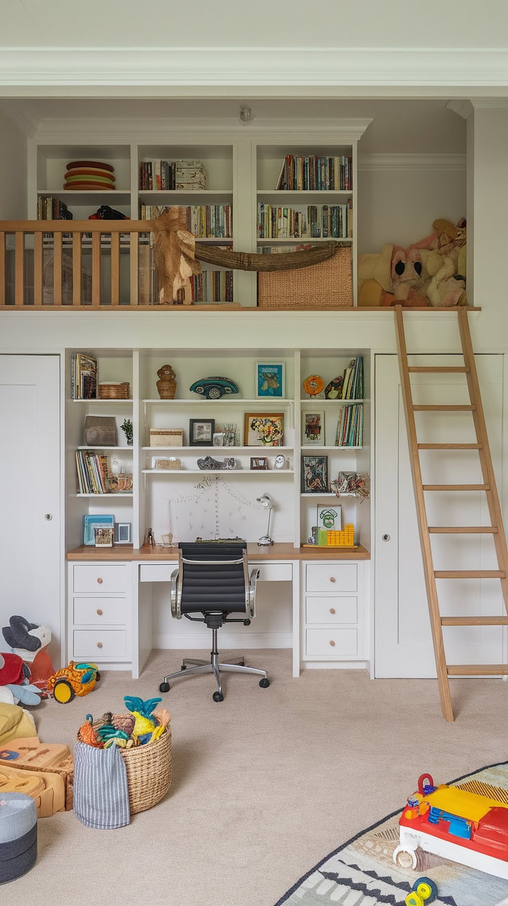Thoughtfully designed for versatility, this office-playroom hybrid integrates a chalkboard wall, cozy reading corner, and a loft, maximizing both study time and spontaneous play. Perfect for homes needing multifunctional kids’ spaces and adult productivity zones.