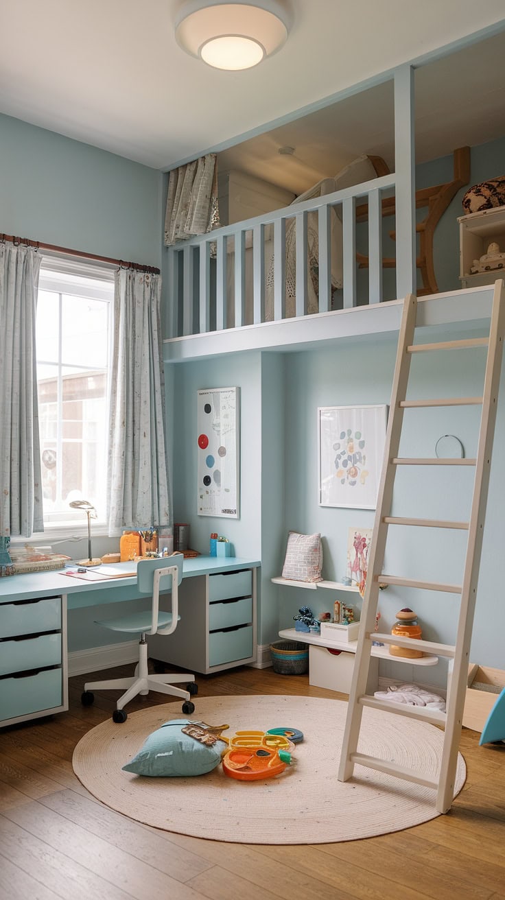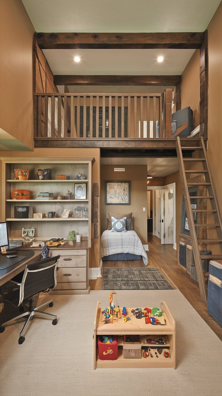 This clever office and playroom pairing optimizes every inch by placing a kids’ study desk alongside a playful loft. Whether used as a homeschool hub, a guest room, or a shared boys’ bedroom, this configuration brilliantly combines practicality with creativity.