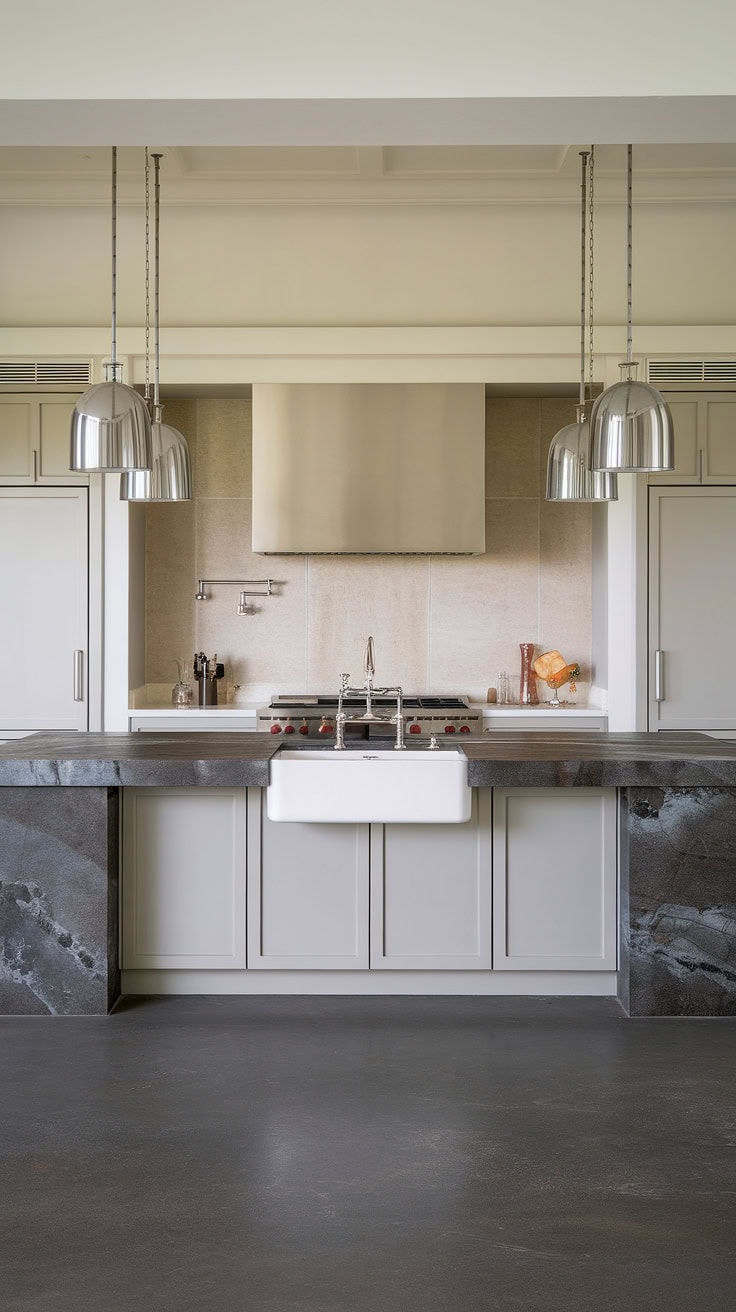 Understated yet sophisticated defines this open-plan kitchen. The dark grey marble island contrasts beautifully with matte grey cabinets, enhanced by a warm beige backsplash and minimalist pendant lighting, creating an ideal example of modern opulence.