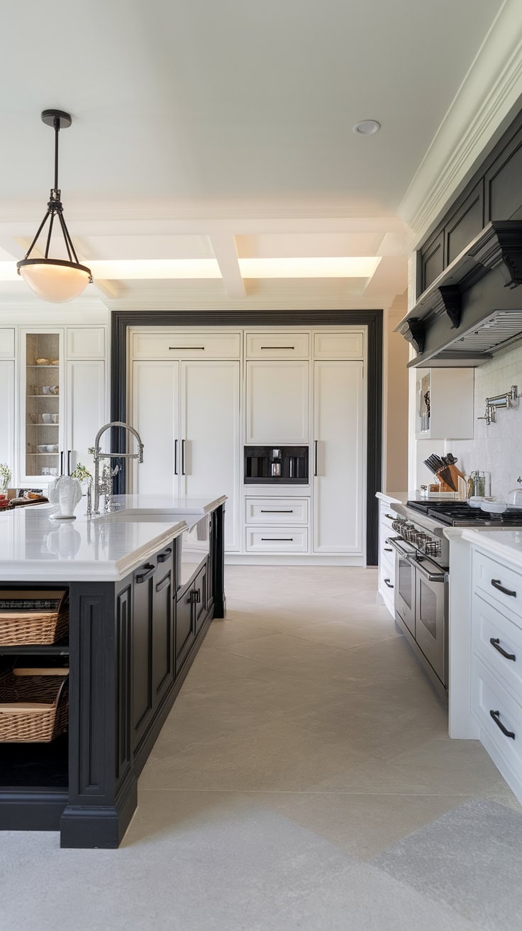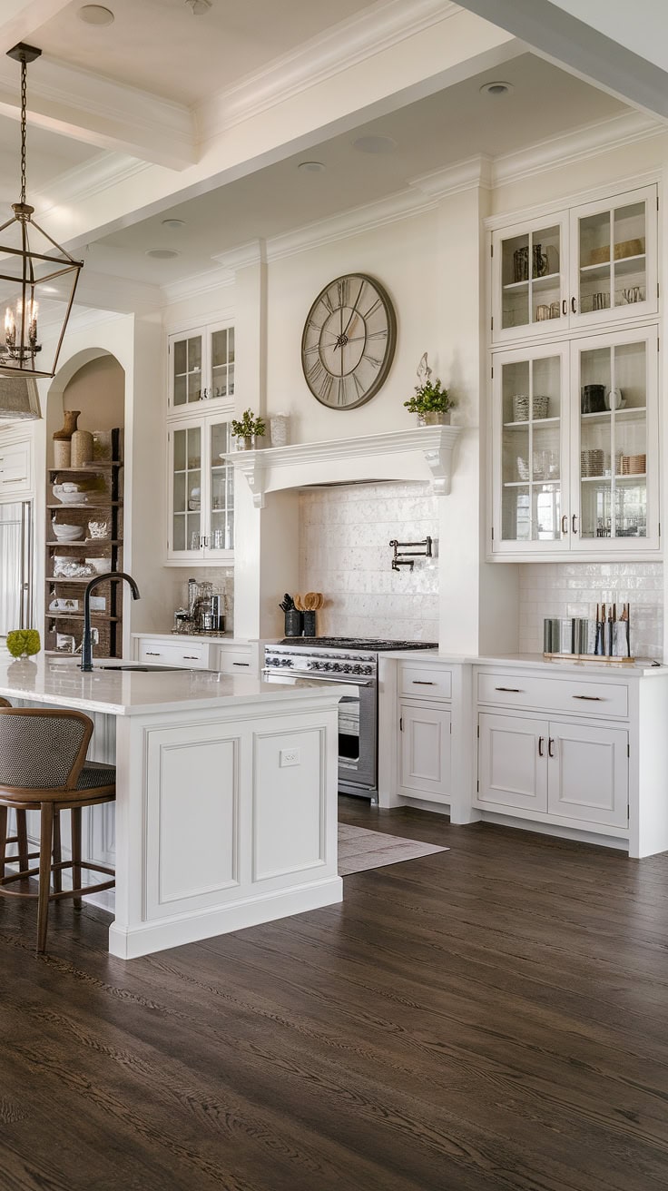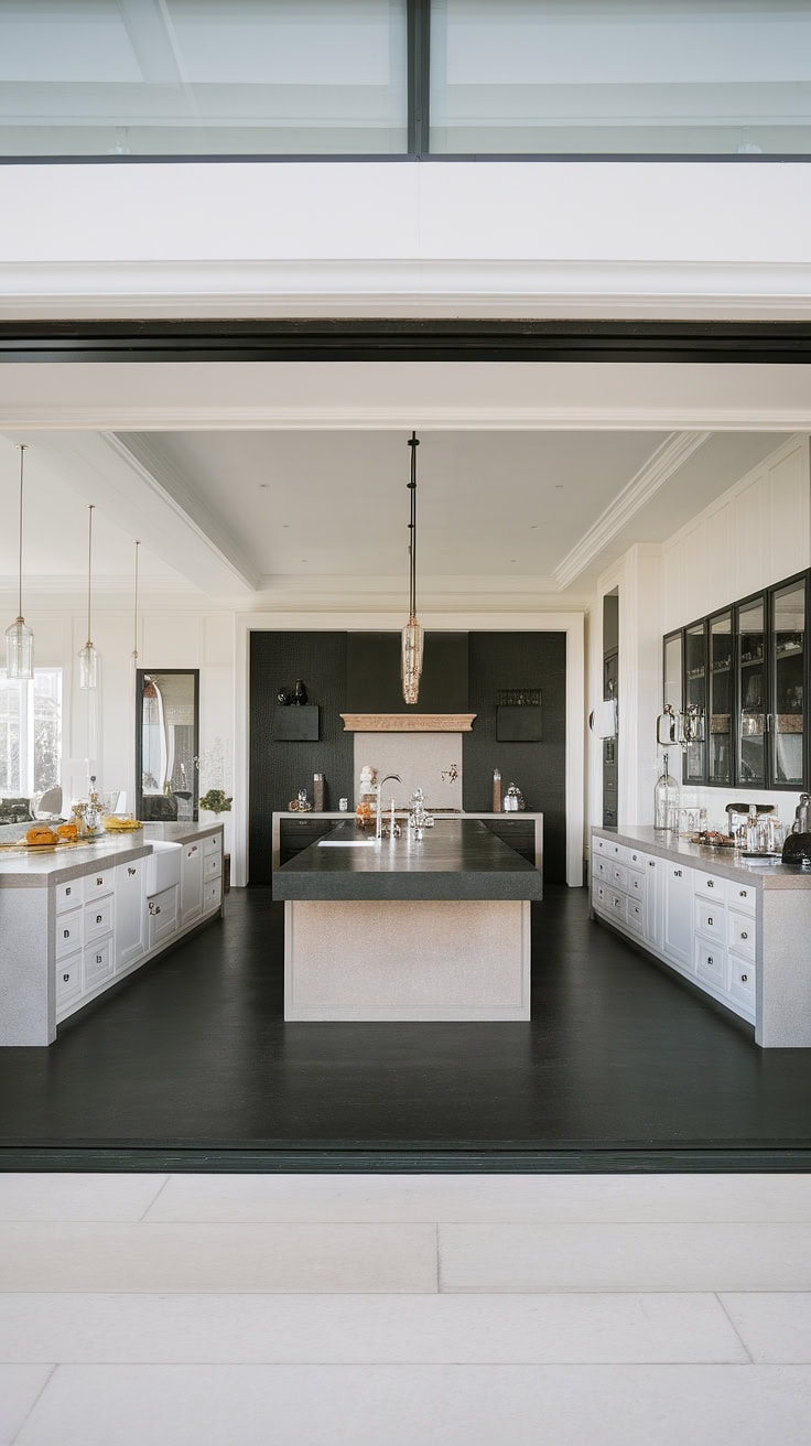 Defined by crisp lines and a sophisticated palette, this open-plan kitchen boasts a striking island with black fixtures atop a white countertop, anchored by glass-fronted cabinets displaying a curated collection of cookware—a perfect marriage of aesthetics and utility.