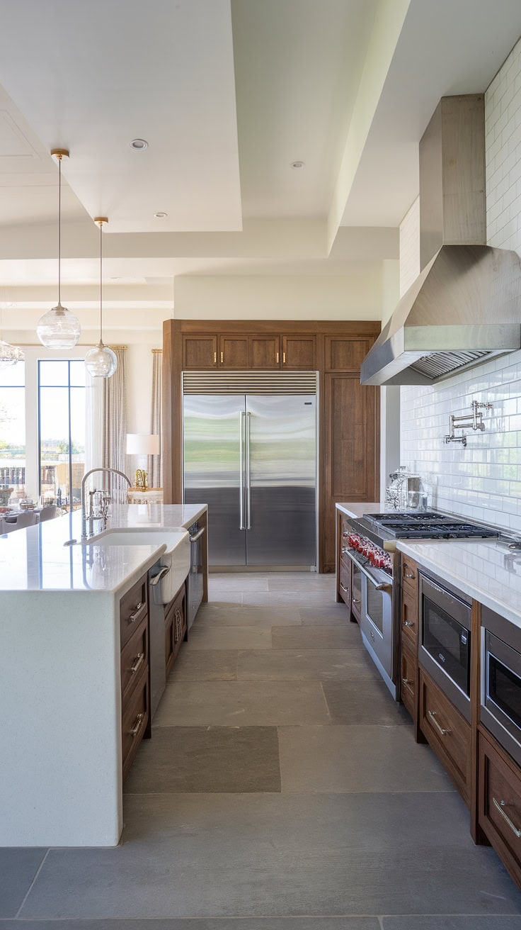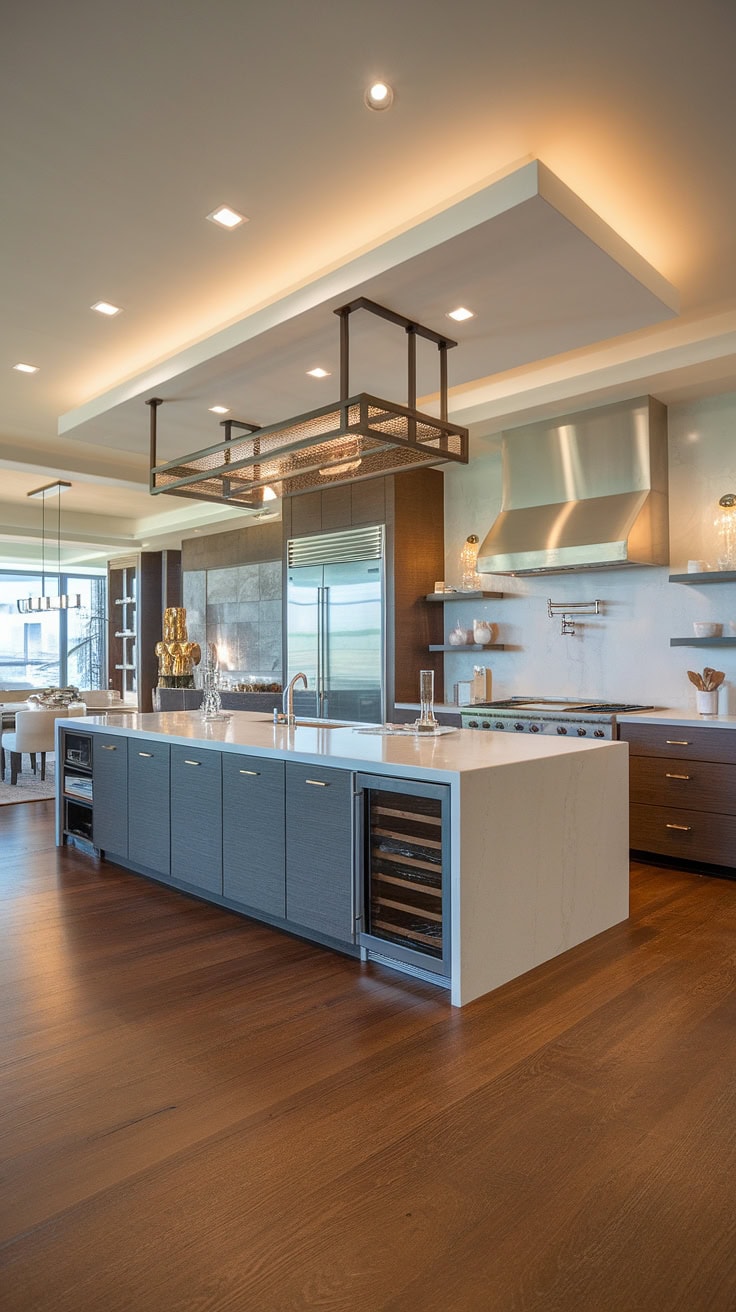 Bright and expansive, this contemporary kitchen features a generous island that doubles as a prep station and casual dining area. Integrated appliances and streamlined cabinetry open up the layout, while details like an overhead pot rack and custom shelving highlight the design’s thoughtful touches.
