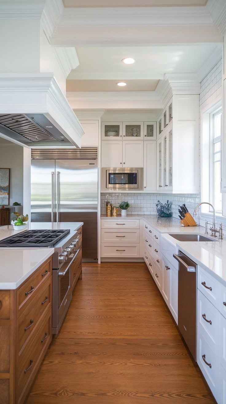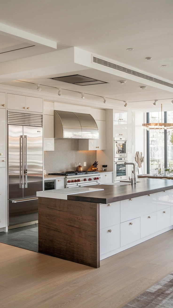 This refined space blends brilliant white cabinetry, a deep-hued island, and a warm wood accent wall for a kitchen that exudes elegance and utility. An ideal centerpiece for modern lifestyle demands.