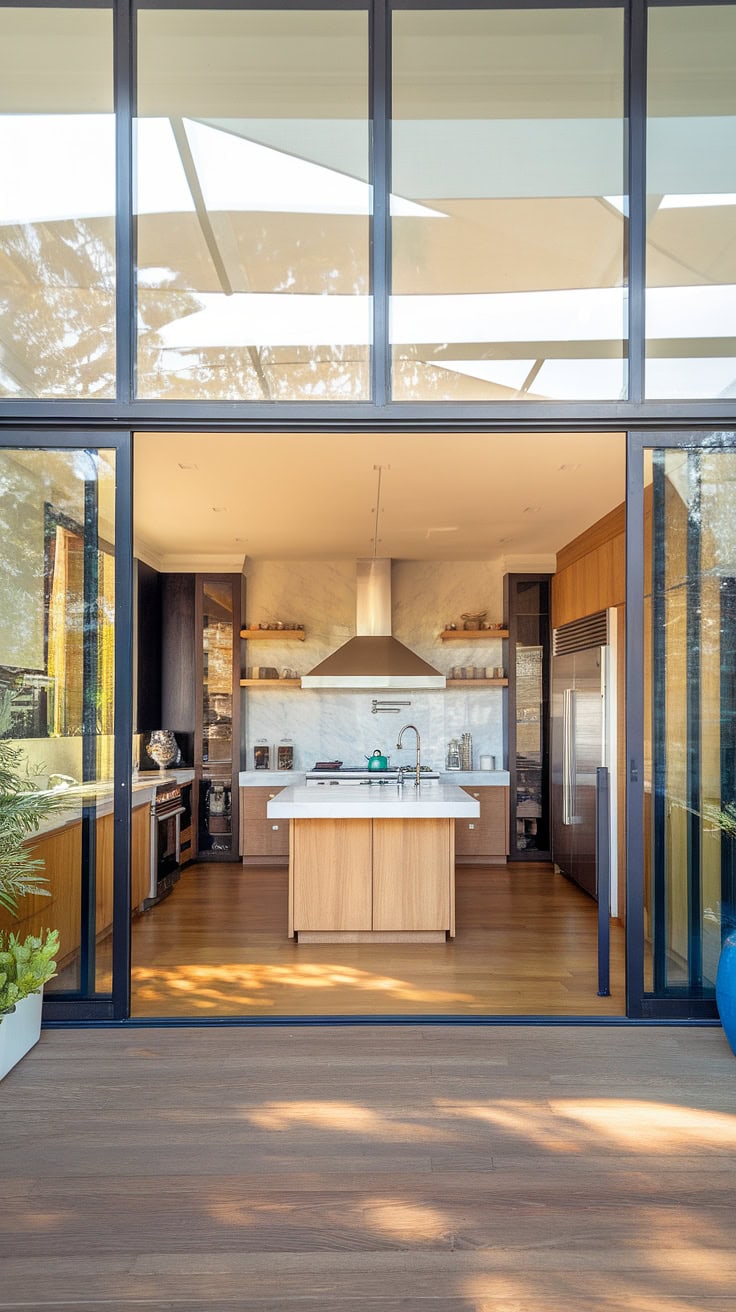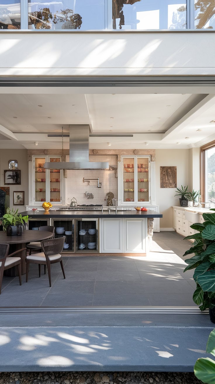 Sun-drenched and spacious, this kitchen features towering glass walls that infuse the space with natural brightness. It perfectly combines luxury with practicality, ideal for both daily dining and lavish entertaining.