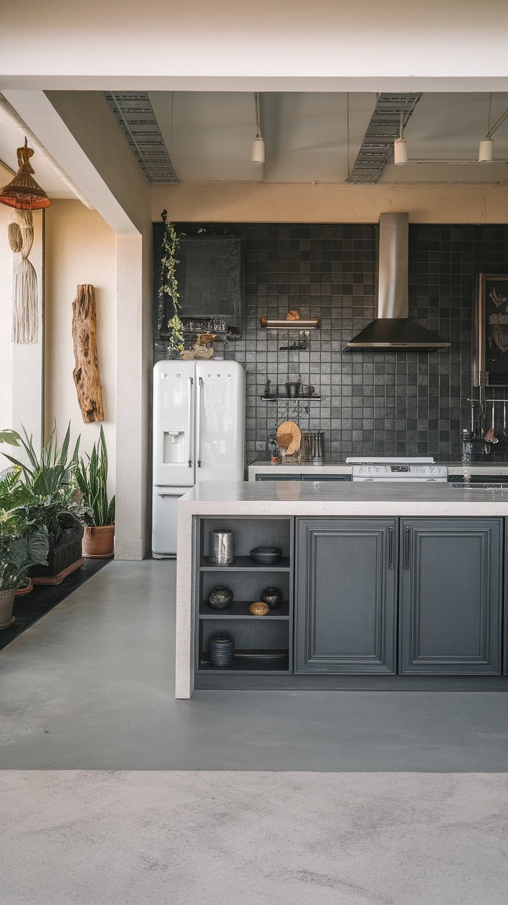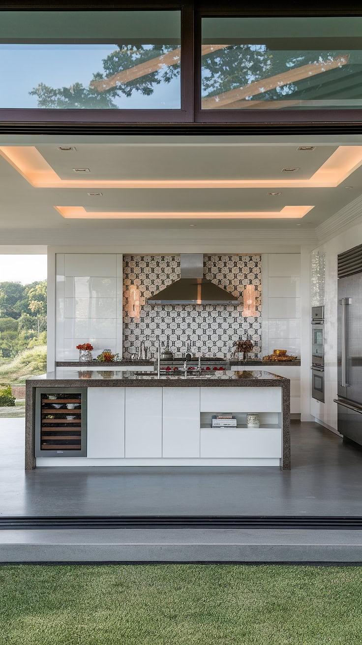 Combining sophisticated design with panoramic views, this kitchen showcases a white interior offset by a dark granite island. The geometric tile backsplash injects artistic flair while stainless steel appliances and grey concrete flooring complete the chic urban aesthetic.