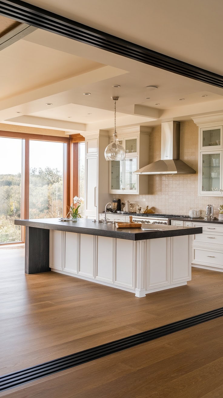 This kitchen reimagines modern luxury with crisp white cabinetry offset by a bold dark island. The space is bathed in natural light from generous windows, harmonizing with warm wood flooring and neutral backsplashes. A distinctive pendant light caps off this inviting environment.