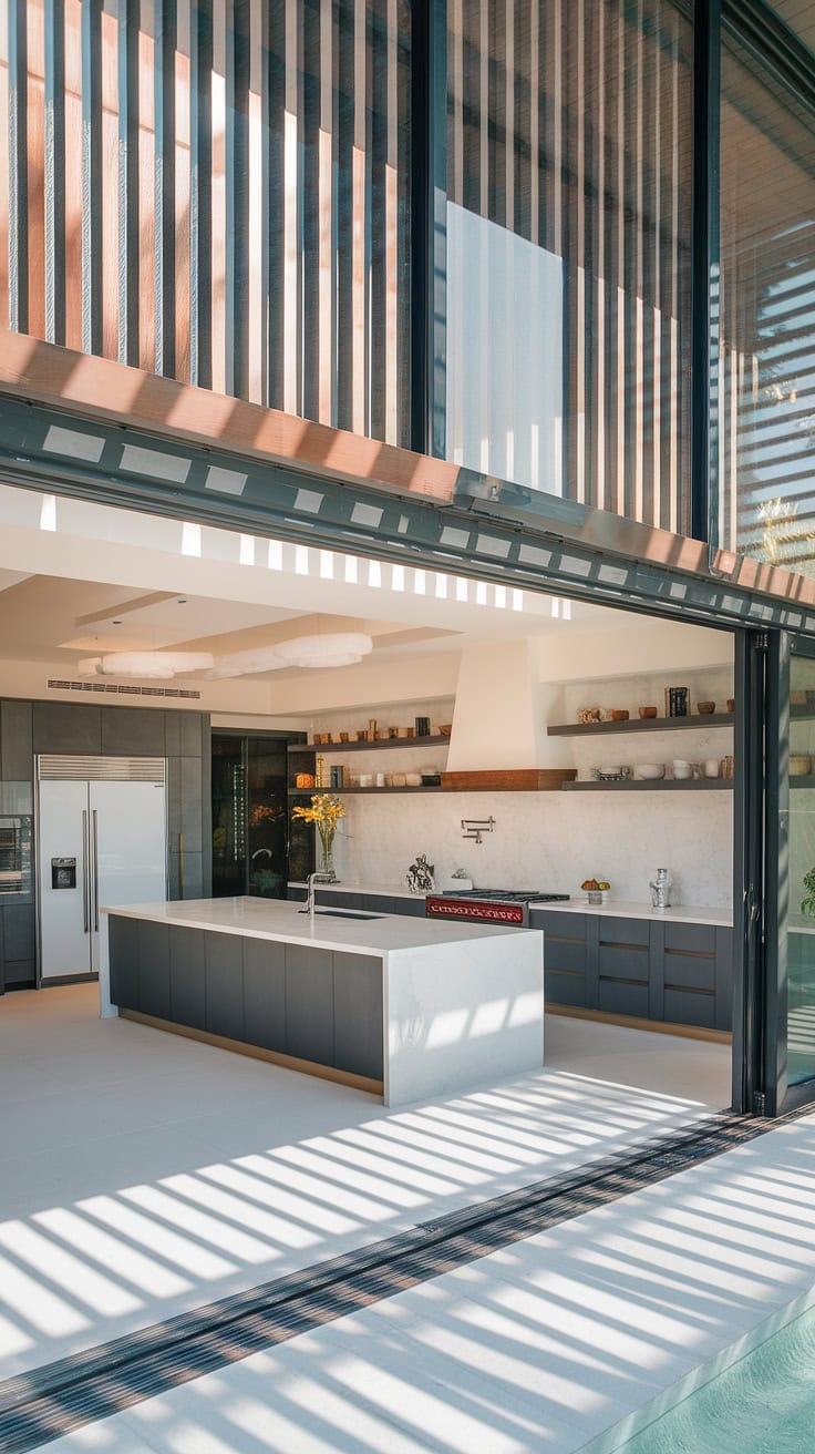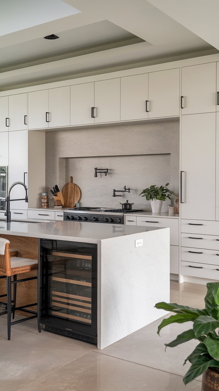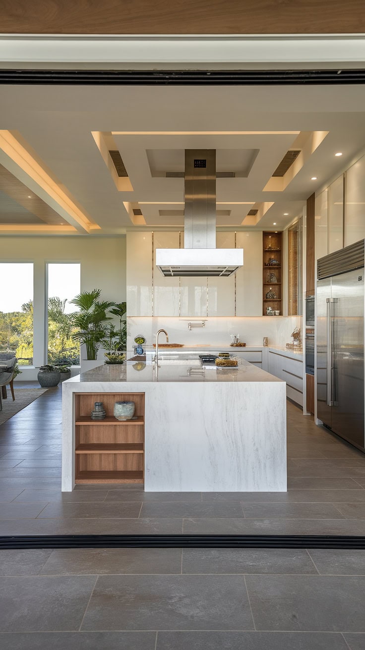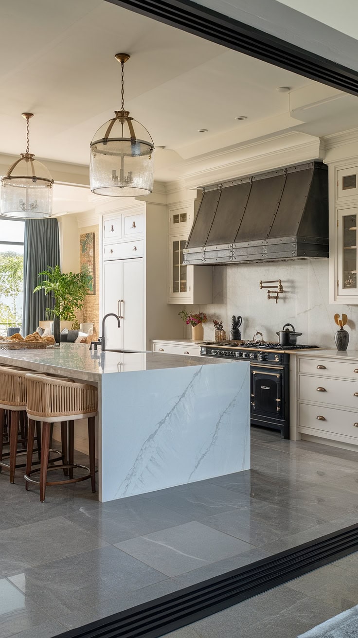 Sunlight cascades over pristine white cabinetry and neutral gray tiles in this open-plan kitchen. A lavish marble island anchors the design, bringing together natural elements such as greenery, which inject warmth and tranquility into the sophisticated culinary environment.