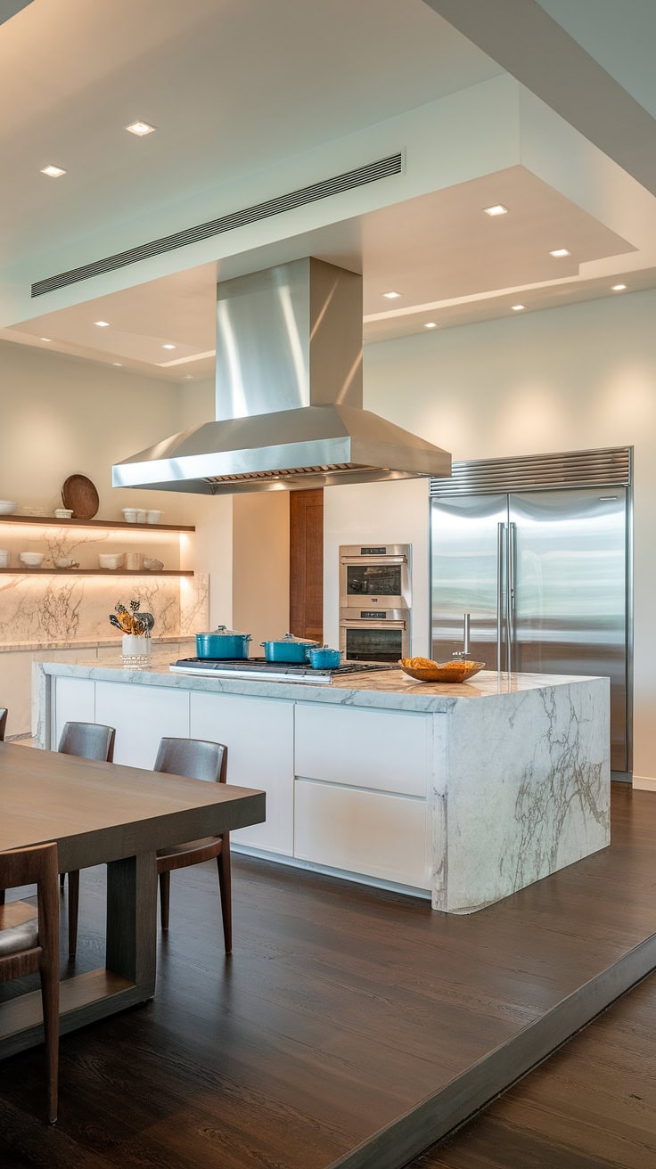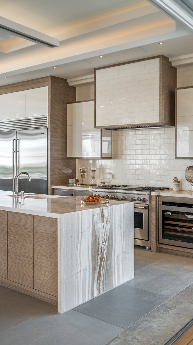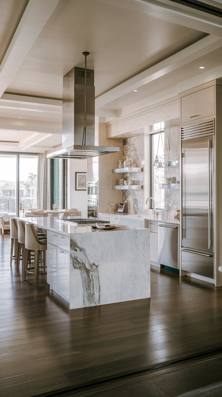 Redefining contemporary elegance, this kitchen seamlessly integrates living and cooking areas. The grand marble island paired with polished stainless steel appliances offers a refined culinary space where luxury meets practical efficiency. A pinnacle of sophisticated home design.